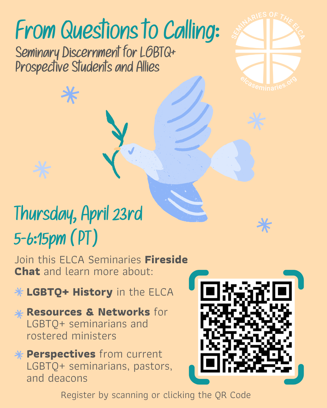 Join the ELCA Seminaries Fireside Chat on Thursday, April 23rd to learn more about seminary, connect with queer folks in ministry, gather resources, and learn more about LGBTQ+ history in the ELCA.