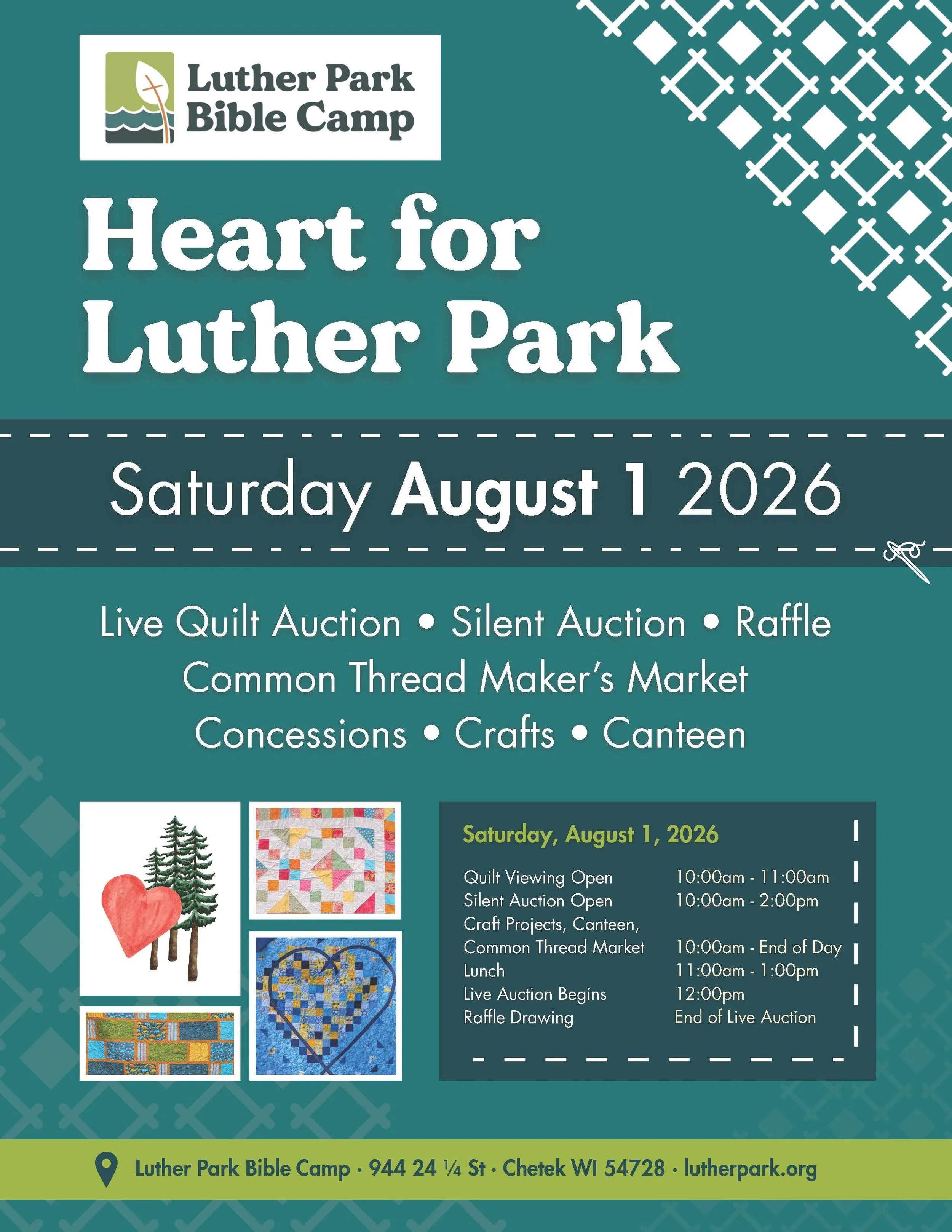 This wonderful event is Luther Park Bible Camp's largest and most substantial fundraiser. The 2025 Heart for Luther Park raised about $26,000 on Saturday, August 2nd, 2025. Many hard working people donate these wonderful works of art to support the mission and ministry of Luther Park.